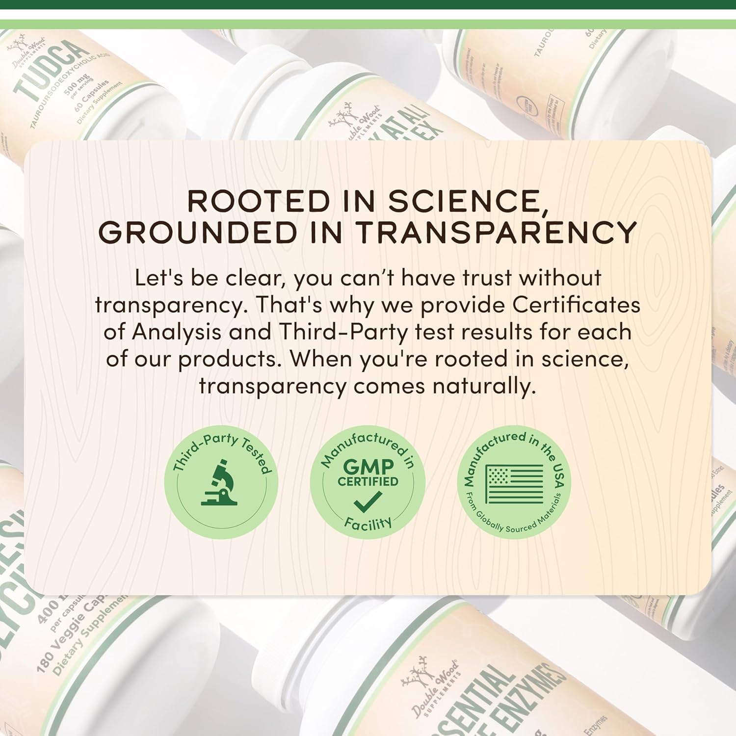 - WE BOTTLE WELLNESS: En Double Wood proporcionamos suplementos puros y potentes que ofrecen un valor excepcional, todos respaldados por un cuidadoso abastecimiento y rigurosas pruebas de terceros