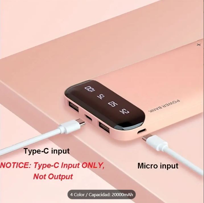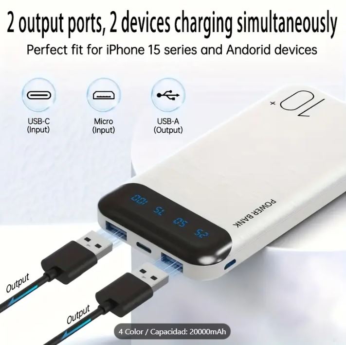 Power bank portátil de gran capacidad 20000mAh, cargador USB portátil 5V2.1A, pantalla LED y digital, compatible con dispositivos iOS/Android, salida 2xUSB, entrada Type-C/Micro, batería de polímero de litio segura y estable.