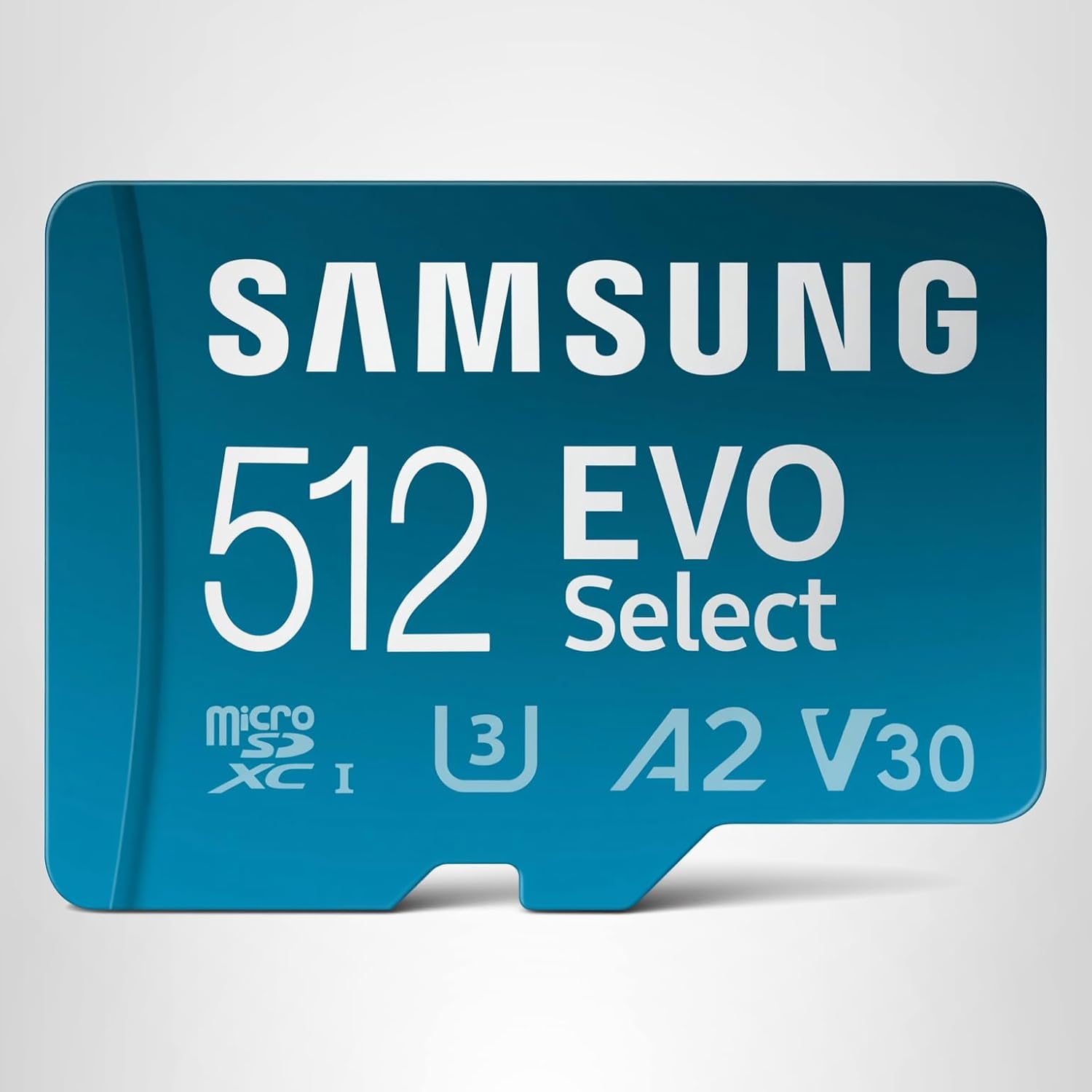 Samsung EVO Select – Tarjeta de memoria microSD + adaptador, microSDXC de 512 GB, hasta 160 Mbps, 4K UHD, UHS-I, C10, U3, V30, A2, celulares inteligentes, Nintendo Switch y tabletas (MB-ME512SA/AM)