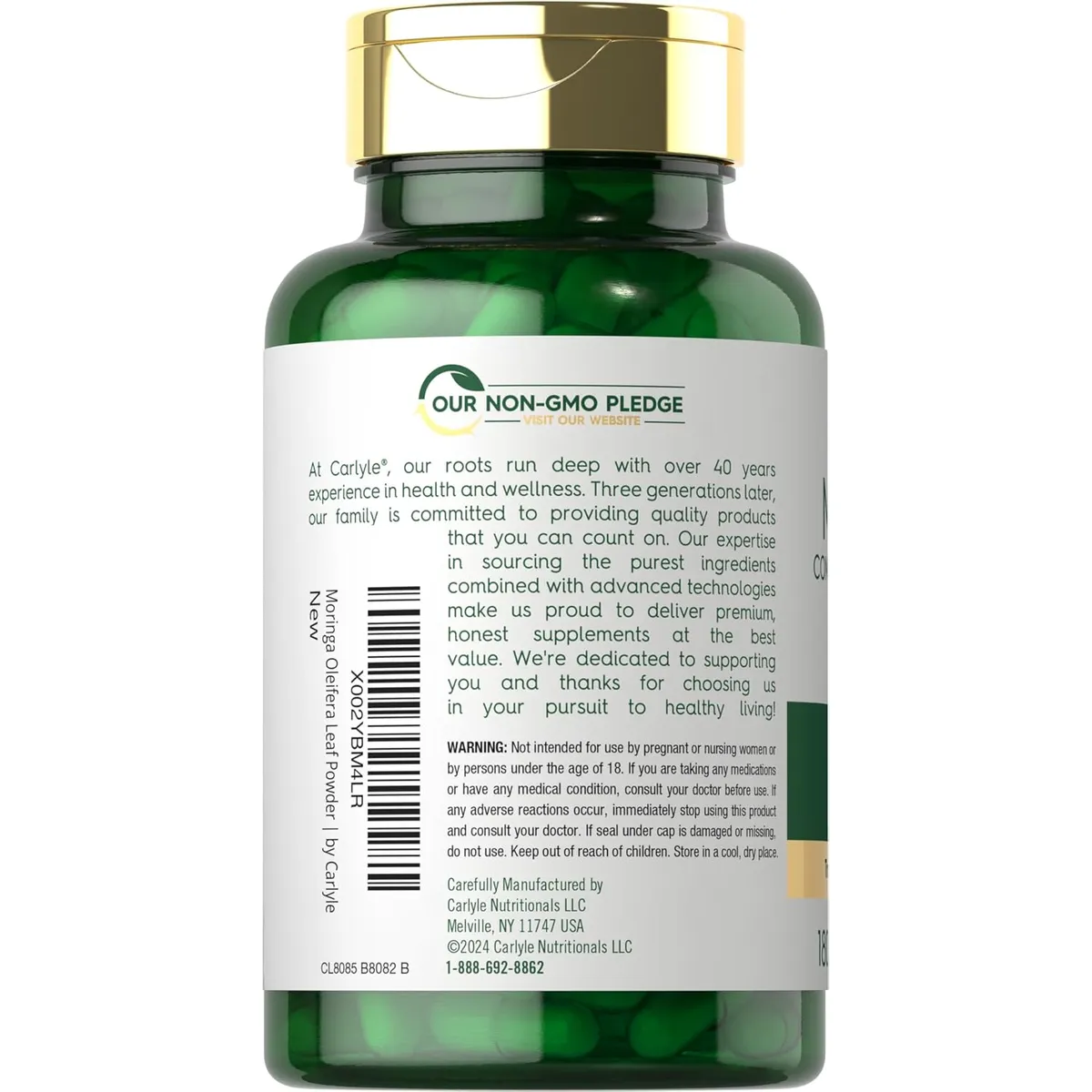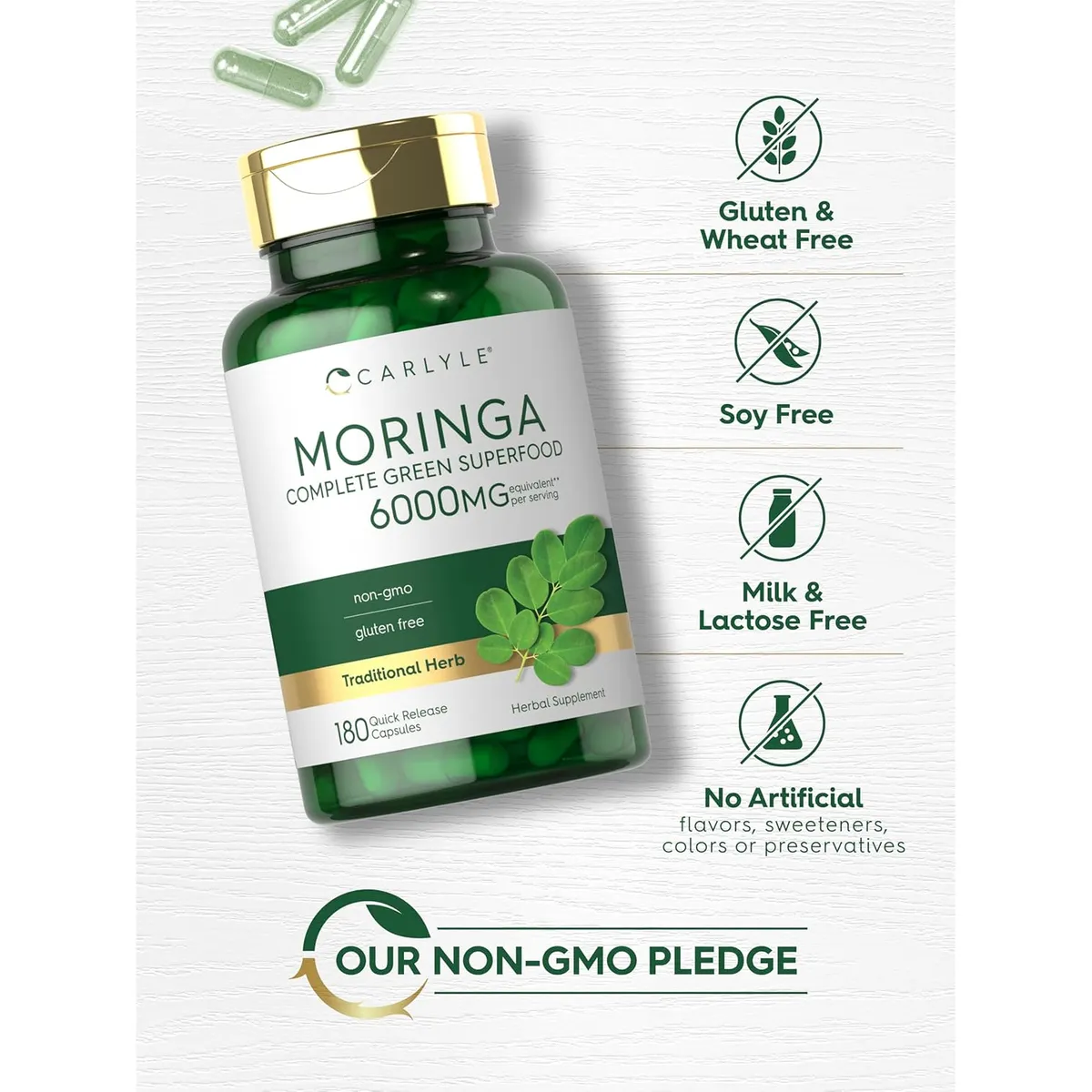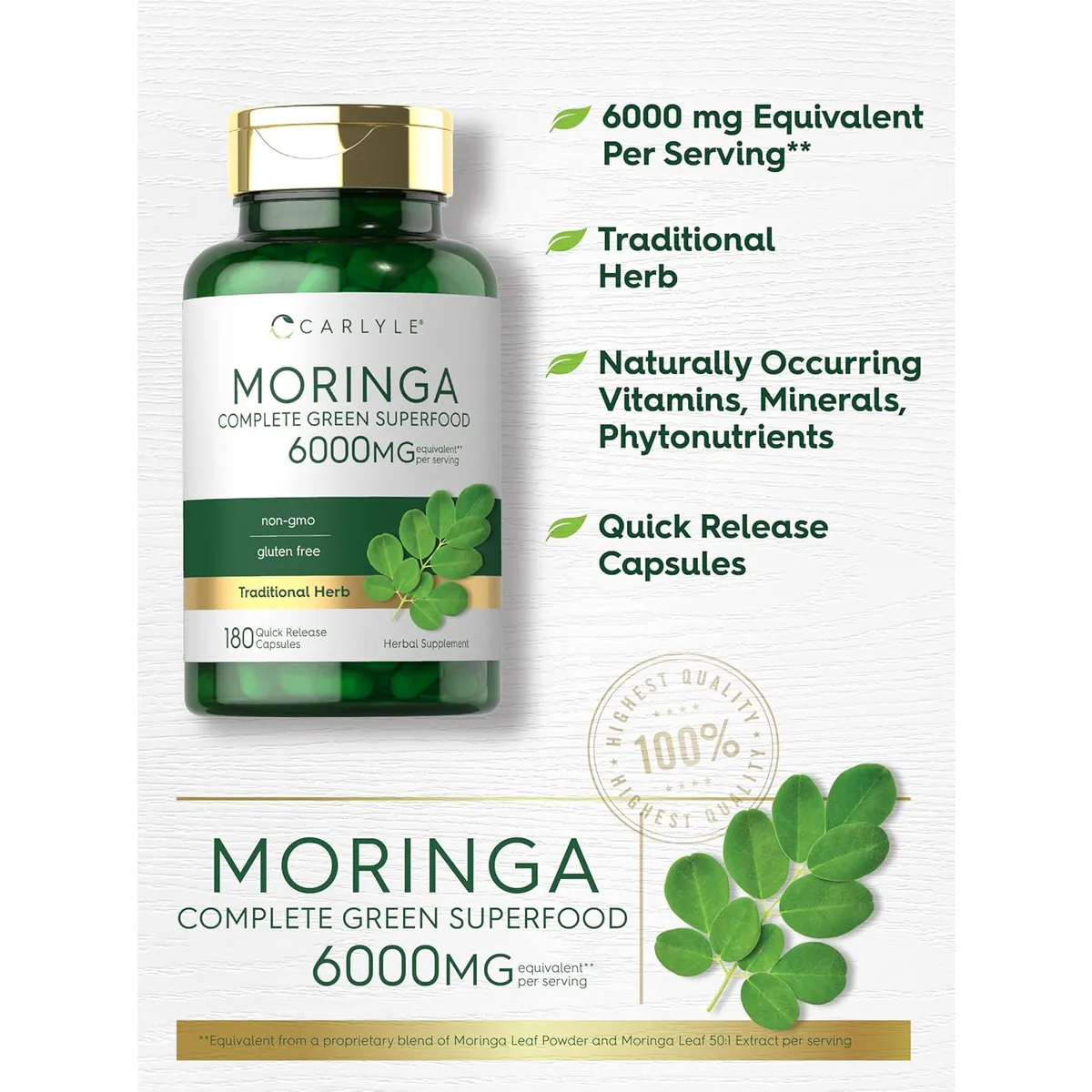 Carlyle Moringa Oleifera | 180 Cápsulas | Suplemento Sin GMO y Sin Gluten | Superalimento Verde Completo | de Polvo de Hoja de Moringa